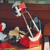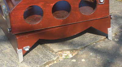 ... is made of 9mm plywood, similar as the mirror box. The ground board forms a lid to the rocker box, containing the entire telescope. This is similar to the concept made up by Pierre Strock, that had been copied over the years by many others. At the corners of the ground board (actually it is a "ground box") are for aluminum claws that can be pushed into the soil. This fixes the telescope on the ground and increases the stability of the scope during operation. |