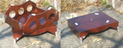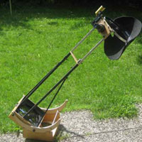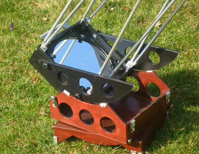 The mirror box is held within the rocker box by several small wooden bars. Both finders, the upper ring, secondary mirror, focuser, light shroud, altitude bearings, eyepieces, and finders fit into the box. Only the poles and the light baffle go extra. The "ground box" forms the lid of the box and helps as well to lock the mirror box. Both halves of the transport box are connected by levered clamps. The entire box can be carried by a handle attached to the mirror box. |