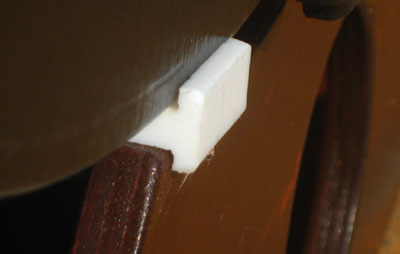 The teflon blocks of the altitude bearings are designed to guide the altitude wheels and to prevent them from slipping off. The bearing surface is a relatively smooth laminate that has more friction than the commonly used Ebony Star. This helps in particular for smaller, lightweight Dobsonians to stay put when changing eyepieces. |