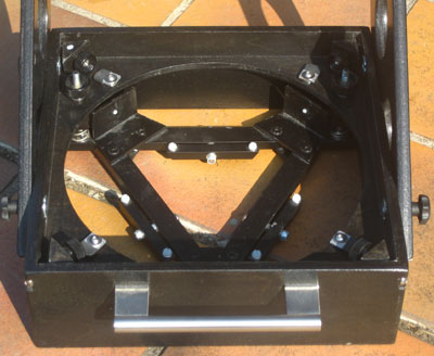 ... is of the Ross-Sackett-type and has proved well already in one of my smaller telescopes. It is compact, stable, and easy to adjust. For transport, the secondary holder including the secondary (50mm minor axis) can be removed from the spider by means of a thumb screw. The spider is eccentric, which minimizes torsional movements already at low tension of the spider legs. |