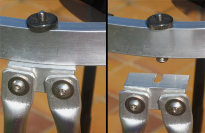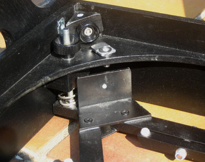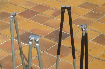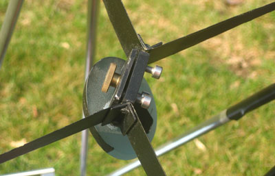 ... is made of 10mm × 1mm aluminum tubing. The truss frame consists of the 8 poles which are connected pair wise at both the upper an lower ends, forming thus a single structure. The ends of the poles were squeezed flat in a vise. The upper pole seats are similar to those of my other telescopes. Instead of quick release levers, I have used here bolts and thumb screws. This type of pole seats makes for a very rigid connection without any loose parts. |