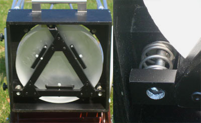 Collimation is achieved from above by two M6 threaded rods that are bolted to the horizontal beam of the mirror cell, via two spring-loaded knurled nuts.