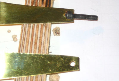 | The spider is made of 0.3 mm brass that can be cut already with scissors. The spider legs are glued to slotted bolts with heavy duty epoxy glue. The small hole in the brass sheet considerably increases the stability of the glued joint. |