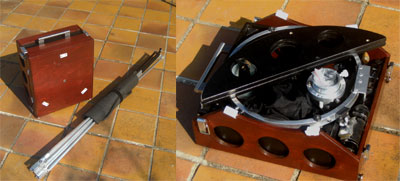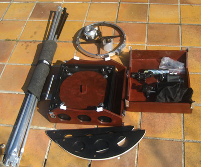 Here the box is ready to go. It measures 35cm × 31cm × 17cm. The bundle of poles is 104cm long. The total weight of the entire telescope is roughly 11kg (without eyepieces, but with both finders). |