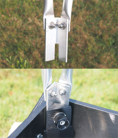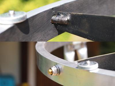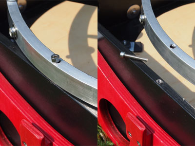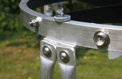 ... sind aus 15mm × 1mm Alurohr. An den Verschraubungspunkten werden die Stangen im Schraubstock platt gedrückt. Die obere Stangenklemmung funktioniert ähnlich wie bei meinen anderen Dobsons. Anstelle von Schnellspannern sind hier jedoch Rändelmuttern zum Einsatz gekommen. Bei dieser Stangenklemmung gibt es eine absolut kraftschlüssige Verbindung und keine losen Teile. |