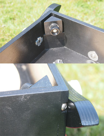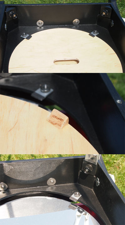 Damit der Spiegel beim Transport im Teleskop bleiben kann, muss er fixiert sein. Dies geschieht über die Spiegelabdeckung. Diese besitzt am Rand dreieckige Holzstücke, die von oben gegen die Fase des Spiegels drücken. Fixiert wird die Blende über die vier drehbaren Mirrorclips, mit denen die Abdeckung stabil auf der Spiegelblende verschraubt werden kann. |