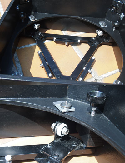 ... ist wie bei meinem 10" Dobson aus 10mm × 20mm Alu genietet mit 6 Lagerpunkten aus Kunststoffschrauben auf drei 10mm x 10mm Lagerbalken. Laterallagerung ist gegen zwei in der Höhe justierbare Kunststoffkugellager. Mehr zum Bau ähnlicher Spiegelzellen gibt es hier.