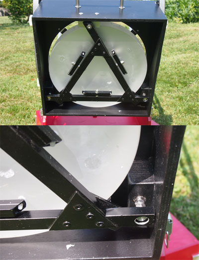 Die Justage der Zelle erfolgt von oben an zwei Punkten über zwei M8 Schrauben, die am unteren Querträger über Passscheiben drehbar gelagert sind. Die Schrauben laufen durch Gewindeeinsätze in den Holzblöcken an der Spiegelbox (siehe hier) und gehen durch die Spiegelblende nach oben durch. Die Zelle ist somit bequem von oben justierbar.