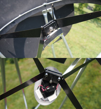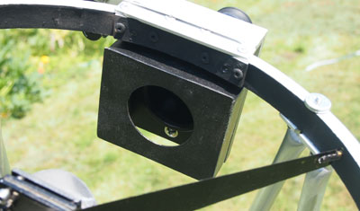 ... ist ein Kineoptics HC2 Helical Crayford, der permanent auf einem versteiften 12mm OAZ Board montiert bleibt. Die Passung an die Rundung ist mit der Oberfräse gefräst (siehe hier). Auf der Rückseite ist eine OAZ Blende montiert, die die notwendige Größe der Hutblende und damit die Windanfälligkeit drastisch zu reduzieren hilft. |
