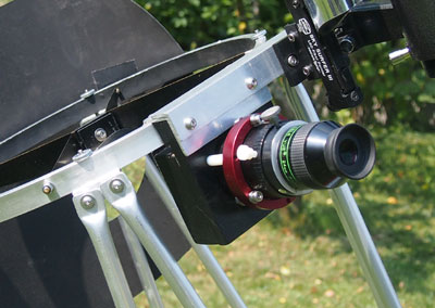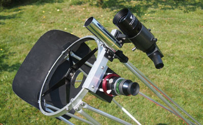 ... besteht aus einem 10mm × 20mm Monoring mit 340 mm Innen-Durchmesser. Die Hutblende ist über Druckknöpfe anklipsbar und besteht aus schwarz lackiertem 0.8mm PE-Material (siehe hier). Als Sucher dienen ein Skysurfer 3 und ein 10x50mm Winkelsucher. Um beide in ergonomischer Reichweite zu haben, sind beide an einem Ausleger montiert.
