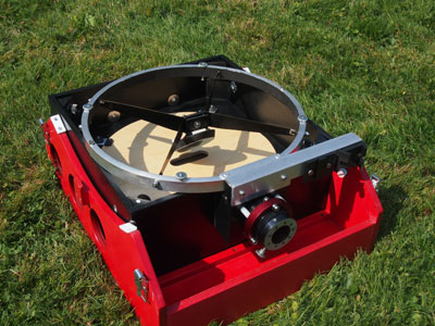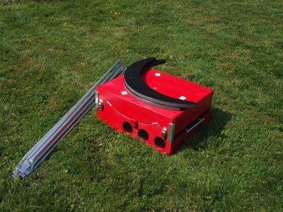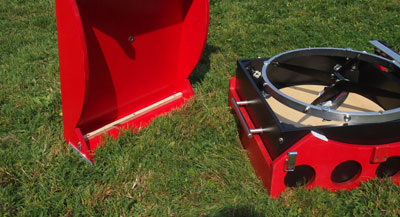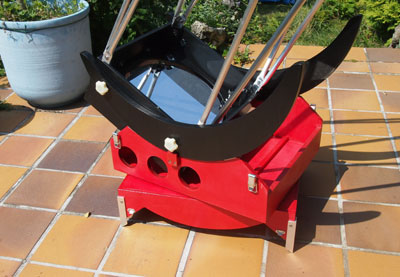 ... ist aus 12mm Multiplex und ebenfalls über Spundung verleimt. Das Groundboard ist das Gegenstück zur Rockerbox, und beide zusammen bilden die Transportbox. Dieses Konzept ist angelehnt an das Design von Pierre Strock, das über die Jahre hinweg schon vielen anderen als Vorlage diente. Das Groundboard hat an den Ecken vier Krallen aus Aluwinkeln, die zum Beispiel auf einer Wiese auch in den Boden gedrückt werden können. Dadurch wird das Teleskop zusätzlich fixiert und steht stabil auf dem Boden. Die Aufstellung auf vier Punkten funktioniert auch auf hartem Untergrund in der Praxis hervorragend, auch wenn das Ganze in der Theorie eigentlich überbestimmt sein sollte. Die Sicheln sind aus 18mm Multiplex und haben einen Durchmesser von 60 cm. Lagerung ist sowohl in der Höhe als auch im Azimut über Ebony Star auf Teflon. |