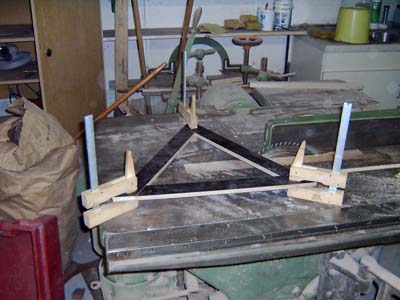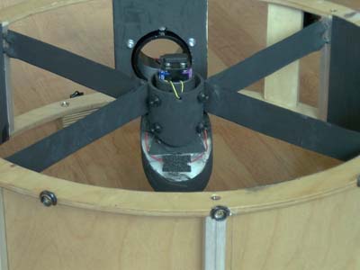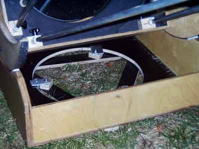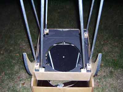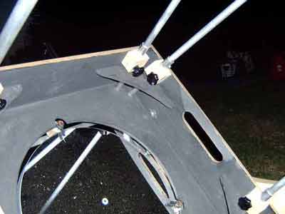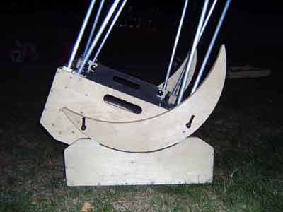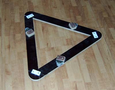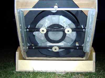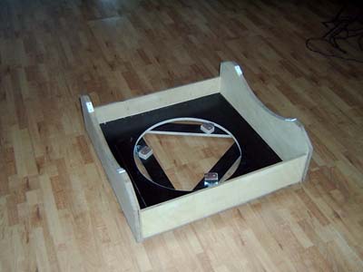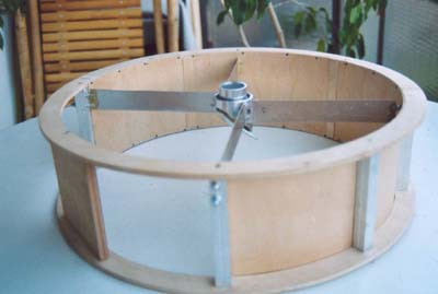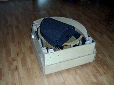 Das Bodendreieck besteht aus 12 mm Siebdruckplatten-Latten, die über Eck verzinkt zum Dreieck verleimt wurden. Die Azimutlagerung besteht aus Teflon auf einem zusammengestückelten Ebony Star-Ring, der unten auf die Rockerbox laminiert wurde, sowie drei kleinen Rollen. |
