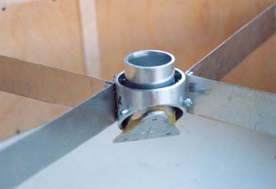 Die Justierschrauben sind mittlerweile durch Rändelschrauben ersetzt. Durch diese Konstruktion sitzt der Fangspiegel (mit Silikon geklebt) fast auf der Höhe der Spinne. Der Hut kann dadurch sehr flach gehalten werden, ohne dass der Fangspiegel unten oder Spinne/Halter oben herausschauen, was ich auf jeden Fall vermeiden wollte. Außerdem wird das Drehmoment, dass der Fangspiegel auf die Spinne ausübt, erheblich verringert. Die Spinne besteht aus sehr dünnem Alublech, ich glaube 0.5 mm oder so. Nein, ich habe keine Obstruktionsparanoia. Ich hatte einfach nichts anderes da. Außerdem konnte ich es mit der dicken Schere schneiden. Schick, oder? Für eine normale Spinne wäre das alles zu instabil. In der Verbindung mit der exzentrischen Anordnung (man baut nicht mehr ohne) ist das ganze aber auch ohne große Vorspannung extrem stabil. Die Verbindung zum Hut erfolgt über Inbusschrauben mit geschlitztem Kopf, in die die Spinnenbleche eingeklebt wurden. Alu kleben ist nicht so einfach. Ich verwende dazu UHU plus Acrylat. Der normale Zwei-Komponenten-Kleber UHU plus schnellfest ist nicht geeignet, die Klebefläche platzt irgendwann ab, selbst wenn die Alufläche angeschliffen wurde. Nach