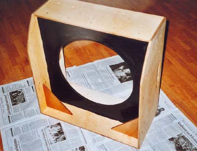Die Spiegelbox ist aus 9 mm Multiplex mit zusätzlichen Versteifungen unten an der Spiegelzelle und oben an den Klemmblöcken. Die Box ist 50 x 50 cm groß. Die Box ist geleimt und geschraubt. Vorne und hinten ist die Box angeschrägt, um die Rockerbox so niedrig wie möglich und die hintere Rockerboxversteifung so hoch wie möglich bauen zu können. |