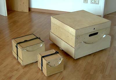 Die erste Version 2003 meines 14-Zöllers habe ich nicht explizit auf Leichtbau getrimmt. Viel wichtiger war, dass das Teleskop kompakt zusammenpackbar sein soll. Ich machte mir zur Vorgabe, dass der Hut in der Spiegelbox verpackbar sein soll, um ihn beim Transport zu schützen. Die Spiegelbox wurde deshalb breiter und höher gebaut als eigentlich nötig und sollte zudem einen Deckel bekommen, so das sie in's Auto gepackt und auch noch etwas darauf gestapelt werden kann. Dadurch wird die Spiegelbox und die Rockerbox zwangsläufig schwerer als eigentlich notwendig, was aber nicht so tragisch ist, da das komplette Paket trotzdem immer noch gut von mir alleine getragen werden kann (Gesamtgewicht etwa 26 kg).