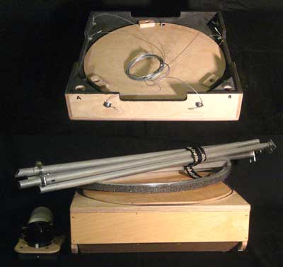 Der Dobson verpackt. Am Anfang hatte ich befürchtet, dass die Strings ein fürchterliches Durcheinander verursachen werden, was aber nicht der Fall ist. Sie lassen sich schön aufwickeln und entwirren sich beim abwickeln wieder quasi von selbst. Alles lässt sich also sehr geordnet handhaben. Die Spiegelabdeckung ist hier sozusagen im "Gebrauchsmodus" gezeigt. Um als Spiegelfixierung zu dienen, wird sie umgedreht und verschraubt. Zum Transport können oberer Ring, Sucher und Bodendreieck in die Spiegelbox verstaut werden. Die Rockerbox dient dann als Deckel. Stangen (teilbar, Transportmaß 85 cm), OAZ, Fangspiegel und Höhenräder sind separat. Das Gesamtgewicht des Teleskops ist 16 kg (davon entfallen 7.3 kg auf den Hauptspiegel), die Maße der zusammengepackten Box sind 45 x 45 x 16 cm.
