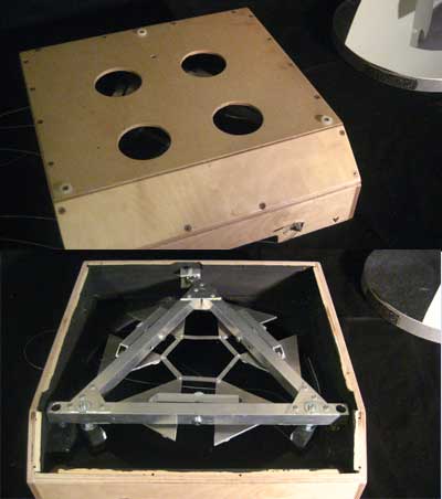 Die Rockerbox ... aus Multiplex 15 mm (Boden) und 12mm Sandwich (Seiten). Das Bodendreieck aus 10x10 mm Aluprofil mit abschraubbaren Füßen.