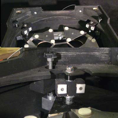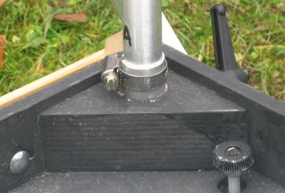 Die Stangen sind 20 x 1.2mm Alurohre, die in Passungen in der Spiegelbox gesteckt werden (ohne Klemmung). Da die Stangen nicht nur auf Druck sondern auch etwas auf Biegung belastet werden, müssen sie ausreichend dimensioniert werden. Die Stangen sind teilbar und haben dann ein Transportmaß von 85 cm, die unteren Anschläge sind einstellbar. |