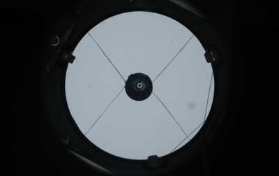 Beim Blick durch den Okularauszug sieht man, dass zwei Strings ( die beiden an der Vorderseite) den Strahlengang kreuzen (rechts unten im Bild). Das lässt sich nur vermeiden, wenn man die Befestigung der Strings an der Spiegelbox näher zu den Stangen hin rückt und dadurch auf Stabilität verzichtet. Ziemlich ähnliche Probleme bekommt man übrigens auch leicht bei 6-Stangen-Konstruktionen (die in der Regel dann jedoch mindestens 10x dicker sind als die Strings). |