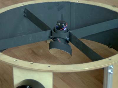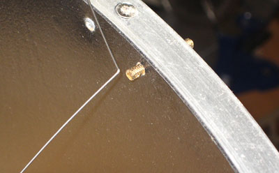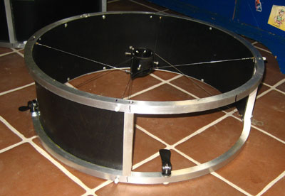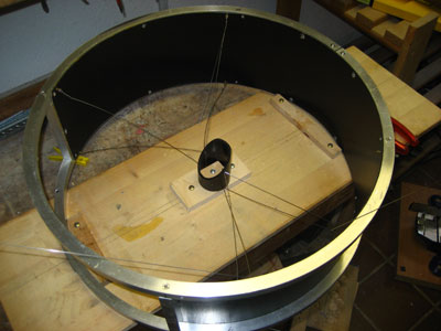 Bei kleineren Teleskopen werden Drahtspinnen ziemlich fieselig zu bauen und man benötigt aufgrund der kleineren Abmessungen und des viel leichteren Fangspiegels nicht mehr deren große Stabilität. Hier ist dann eine konventionelle Spinne aus Metallblechen von Vorteil. Auch bei Monoring-Oberteilen, bei denen man keine große Basislänge realisieren kann, ist eine konventionelle Spinne einfacher zu bauen. | ![]() |