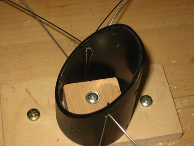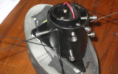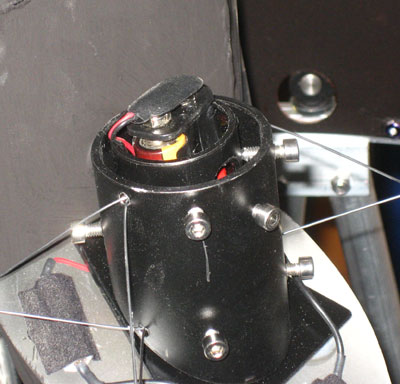 minimieren. Die Spinne greift exzentrisch am FS Halter an und die Spinnenbeine werden gekreuzt, was die effektive Basislänge vergrößert. Am FS Halter ist der Draht nur durchgefädelt, d.h. ein Draht geht vom Hut zum FS Halter, durch den FS Halter durch, und dann wieder zurück. |