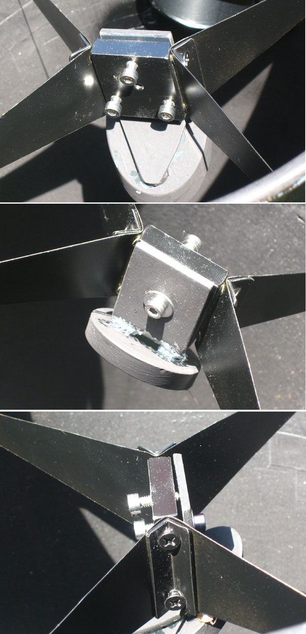 Für eine Spinne verwende ich zwei durchlaufende Bleche, die in der Mitte von zwei verschraubten Aluplatten zusammen gehalten werden. Diese bilden später den fixierten Teil des Fangspiegelhalters (Sackett-Typ, siehe unten), an dem die Spinnenarme exzentrisch angreifen. | ![]() |