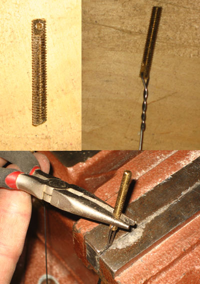 Die Stifte werden mit der Feile abgeflacht und mit einer 1.5 mm Bohrung versehen. Später werden die Federstahldrähte durch diese Bohrung durchgeführt, abgebogen und im Schraubstock eingespannt. Mit einer Zange kann man dann die Stifte drehen und damit den Draht verzwirbeln. Das braucht in der Regel am Anfang ein bisschen Übung, geht nach ein paar Versuchen dann aber ziemlich problemlos. |