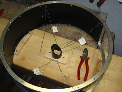 Ganz wichtig ist, dass man die Drähte kreuzweise führt, weil man dadurch eine effektiv größere Basislänge bekommt. Die Kreuzungsstellen fixiert man ein paar Mal mit dünner Litze (aus Elektrokabel) und verlötet das Ganze. Dadurch wird die Spinne noch mal weiter stabilisiert. Alles in allem erreicht man mit so einer Drahtspinne eine Stabilität, an die eine konventionelle Spinne ähnlicher Stärke/Obstruktion/Gewicht nicht heranreicht. Statisch gesehen hat die Drahtspinne genau da ihr Material, wo die stärksten Belastungen auftreten, was bei einer konventionellen Spinne vor allem die Ränder der Spinnenbleche sind. |