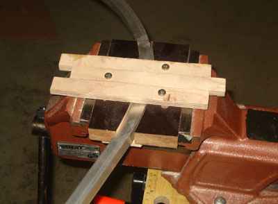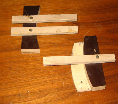 Hierzu verwende ich Holzschablonen, die aus einem möglichst harten Holz bestehen sollten (hier zum Beispiel aus Resten von Siebdruckplatten aus Hartholz). Birke Multiplex eignet sich nur bedingt, da es sich unter der Beanspruchung zu sehr verformt und sich die Aluprofile eindrücken. Der Radius der Schablonen ist etwas kleiner als der spätere Innenradius der gebogenen Profile. Als Richtwert kann man etwa einen 10% kleineren Radius für die Schablonen ansetzen, was jedoch je nach zu biegendem Profil und Beständigkeit der Schablone etwas variieren kann (es läuft also auf try-and-error raus). Die Schablonen säge ich mit der Stichsäge aus (auf exakt senkrechten Schnitt achten!) oder alternativ der Oberfräse. Um eine gute Führung zu erreichen, schraube ich an die Unterseite ein kurzes Brettchen und an die Oberseite drei Leisten wie auf dem Bild rechts.