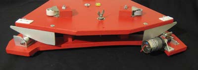 Die Laufflächen der VNS-Segmente bleiben während des Schwenkens der Plattform nicht genau senkrecht auf den Rollenlagern, sondern verkippen leicht. Deshalb ist es vorteilhaft, die Segmente relativ dünn zu machen. Um die nötige Stabilität zu gewährleisten, sind die Segmente deshalb aus Metall und über Winkelprofile von unten und von vorne an der Stirnseite des Tisches verschraubt. Die Segmente wurden mit Schablonen und Stichsäge aus 5 mm Alu ausgesägt und die Kurve der Lauffläche mit einer Feile möglichst genau in Form gebracht. Die Laufflächen wurden zudem etwas gerundet um auch beim leichten Verkippen der Segmente während der Abrollbewegung glatt abzulaufen. |