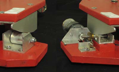 Durch die Senkrechtstellung der Nordsegmente werden die Rollenlager und der Antrieb vereinfacht. Der Motor ist wieder ein RB35 1:600 Getriebemotor (Conrad) und treibt über ein 1:20 Schneckengetriebe (ebenfalls Conrad) eine in Gleitlagern geführte Silberstahlwelle an. Diese Stahlwelle dient als Reibungsantrieb. Bedingt durch die direkte Kraftübertragung vom Dobson auf die Welle und das höhere Gewicht des Dobsons ist die Friktion zwischen Welle und Segment groß genug, dass kein Schlupf entsteht. Alternativ (wie rechts gezeigt) kann man auch den Durchmesser der Antriebsachse zum Beispiel durch einen Aluhülse vergrößern. Mehr zum Antrieb und zur Elektronik gibt es auf einer eigenen Seite hier. |