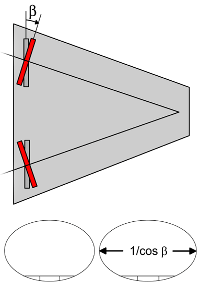Weiterhin wurde das Ellipsensegment geteilt (und der nicht benötigte mittlere Teil entfernt) und die beiden Teile so um eine vertikale Achse gedreht, dass sie senkrecht zur Verbindungslinie zum Südlager stehen. Hierdurch wird die Größe der Querbewegung der Segmente relativ zu den Rollenlagern beim Schwenken der Plattform verringert. Um diese Drehung um einen Winkel beta zu berücksichtigen, sollten die Segmente horizontal um einen Faktor 1/cos beta gestreckt werden. Nach diesen beiden Umformungen kann man das Segment schließlich als Schablone ausdrucken (eine Seite des Segments reicht aus und passt gut auf DIN A4). Im Gegensatz zum Kreissegment haben beim VNS nicht mehr alle Punkte der Lauffläche exakt den gleichen Abstand zum Südlager. Mit ein bisschen Hirnakrobatik kann man sich klarmachen, dass dadurch die Nachführgeschwindigkeit positionsabhängig wird. In der Praxis ist diese Abweichung jedoch unter +/- 1% der Sterngeschwindigkeit. |