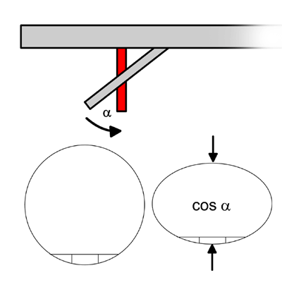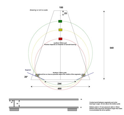 Die notwendige Form für VN Segmente kann sicher auch analytisch berechnet werden, was jedoch das Vorstellungsvermögen der meisten von uns (mich eingeschlossen) übersteigt. Im Folgenden werden wir daher die Form der VNS Segmente als einfache Projektion des Kreissegments in eine senkrechte Ebene bestimmen, das Segment dann in zwei Teilsegmente aufteilen und jeweils leicht um eine senkrechte Achse rotieren. Aus dem Kreissegment wird somit ein Ellipsensegment. Für unsere Breiten wäre eigentlich eine Hyperbel die genaue Form, das Ellipsensegment ist aber auf dem kleinen Abrollbereich eine sehr gute Näherung. Durch die Senkrechstellung wird das Kreissegment (der untere Abschnitt in der Abbildung rechts) vertikal um einen Faktor cos alpha gestaucht, wobei alpha wieder der geografischen Breite entspricht. Aus dem Kreissegment wird somit das Ellipsensegment. Am einfachsten zeichnet man sich den ursprünglichen Kreis in einem Grafikprogramm (zur Not kann das sogar Powerpoint) im Maßstab 1:1, bringt die horizontale Linie an, die die Position der Bezugsebene markiert (wie auf der Abbildung) und markiert den für die Laufflächen benötigten Bereich des Segments. Dann gruppiert man alles zusammen und skaliert es mit dem berechneten Faktor um zum Ellipsensegment. Das VN Segment wird, wie rechts gezeigt, "mittig" zum Kreissegment am Tisch befestigt, so dass der Abstand der Lauffläche zum Südlager im Mittel dem beim Kreissegment entspricht (der mittlere Teil des Kreissegments, der nicht zur Lauffläche beiträgt, wird hierbei nicht berücksichtigt). |