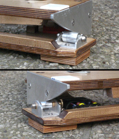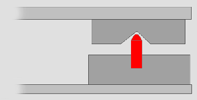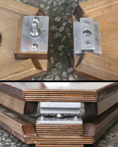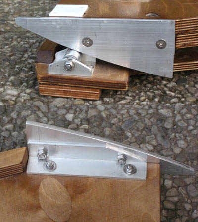 Ein Zapfenlager lässt sich leicht herstellen aus einem senkrecht stehenden Zapfen (z.B. abgerundete Schraube oder Schraube mit Hutmutter), der in einem Konus läuft. Alles in allem extrem stabil und sehr einfach und flach zu bauen. Der Konus wurde hier mit einem Senkbohrer in eine 8mm Aluplatte gebohrt. Ein darüber geschraubtes Aluprofil mit weitem Loch verhindert, dass der Zapfen versehentlich aus dem Konus springt. |