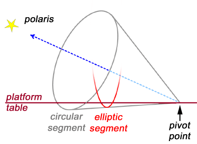 Das normalerweise übliche Kreissegment als Nordlager ist nur ein Spezialfall der für das Nordlager möglichen Formen, die alle auf einem Kegel liegen. Dieser Kegel wird durch die Polachse und einen Winkel aufgespannt, der etwas größer als die geografische Breite ist (damit das Segment überhaupt unter der waagerechten Tischebene zu liegen kommt). Beim Kreissegment steht die Schnittebene senkrecht zur Polachse. Genauso gut können wir die Schnittebene senkrecht zum Plattformtisch legen und erhalten damit eine Ellipse bzw. eine Hyperbel (siehe Kegelschnitte auf Wikipedia). Der Vorteil der Senkrechtstellung des Segments liegt in der direkteren Krafteinleitung in die Bodenplatte und der einfacheren und stabileren Konstruktion von Rollenlager und Antrieb. |