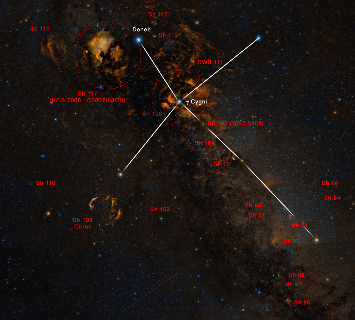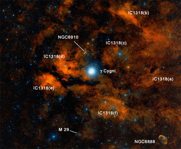The Gamma Cygni complex Sharpless 108 / IC 1318 consists of several distinct parts. Brightest parts include the butterfly nebula (e and d) with its brightest part in the NE, H beta, also visible with OIII. Another even brighter part is NW of gamma Cyg (b). Many other patches responding to H beta, UHC or OIII (mainly S of gamma Cyg, part f). |