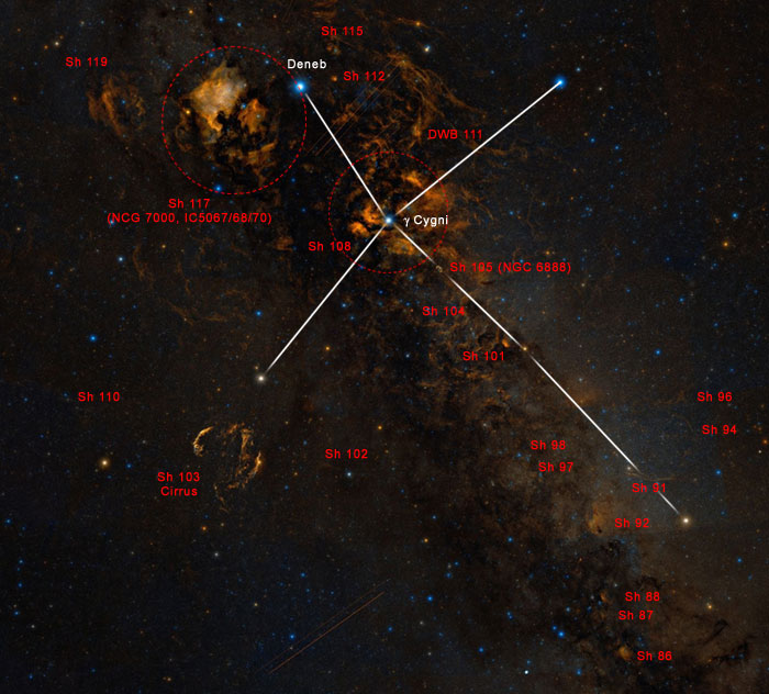 Sharpless 119 This huge HII region is east of the North America Nebula, bending around 68 Cygni With H beta and 80x, under excellent conditions, this HII region is very distinct. Patchy nebula W of 68 Cygni, curves around N of star and forms long streak along E side towards S. E part appears smoother than W and N part, which are more patchy.
