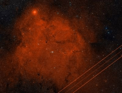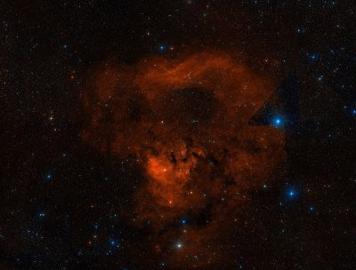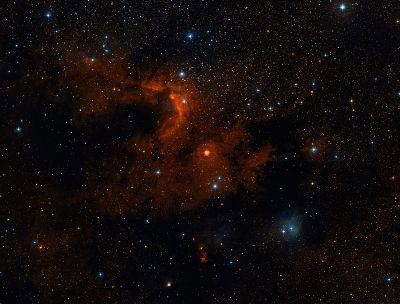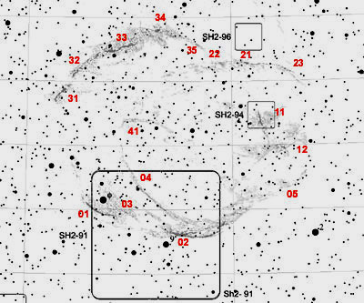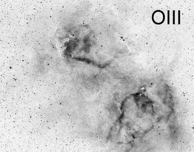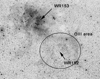 Sharpless 132 This is a HII region excited by two Wolf-Rayet stars, WR 153 and WR 152. WR 153 is at the center of the actual Sharpless nebula. Appears with OIII filter as a very large faint nebula with round dark structure to the E. WR 152 is a bit offset from the main nebula and situated in the center of a high ionization region emitting mainly in OIII and hardly visible in the DSS image. It is marked in the lower, inverted image. This extension increases the size of the nebula to around 1.5° (OIII emission is hardly visible in the DSS image). The lower image shows an OIII frame of this area.
