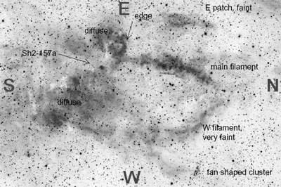 The brightest OIII part of the nebula is the extension that trails from the central part for about one degree towards north. In the low power eyepiece equipped with OIII filter, this long feature is immediately visible upon field sweeping (as it is very large) as a long milky bar that usually requires moving your telescope to scan its entire length. Distinct markers are the fan shaped open cluster Markarian 50 to the west and NGC 7538, a very bright and distinct small nebula about one degree north of it. Just east of this main part is another, smaller nebulous patch (OIII). West of the main filament is another shorter and fainter filament (OIII). South of it are another two large, but diffuse areas (best with H-beta), with a small bright knot in between. This knot (sometimes referred to as Sh2-157a) shines in HII and is a distinct object without filter or with H beta filter. Very detailed narrow band images of this area have been taken by Richard Crisp and Dean Salman. Richard Crisp's image of 2004 has actually stimulated my interest in observing this object and all the other Sharpless objects that followed over time.