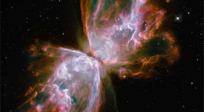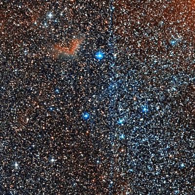 The lower HST image shows the central region of M8, the so-called Hourglass-Nebula. As evident from the HST image, the peculiar shape of this region is due to dark structures superimposed to the bright central part of the emission nebula. |
