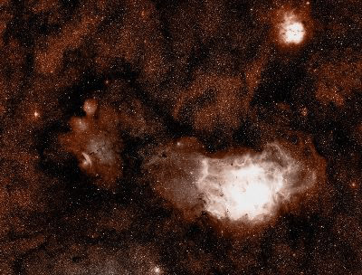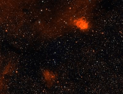 Sharpless 8 This is the HII region NGC 6334, named the Cat's Paw Nebula due to its peculiar shape. From my latitude, this object is only slightly above the horizon, three nebulous patches around stars could be discerned with difficulty using UHC filtering. field size 1°