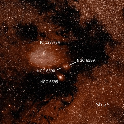 Sharpless 35 and 37 Sh 37 is a large complex comprising several emission and reflection nebula. IC 1283, the HII part of this molecular cloud is difficult and was only suspected as a weak glow around a small clump of stars. There are two RN associated with this molecular cloud: NGC6595 is a bright RN around two stars of similar brightness, NGC6589/90 is a somewhat weaker RN around an unequal pair of stars. Sh 35 is a large HII region extending from this area towards SW.