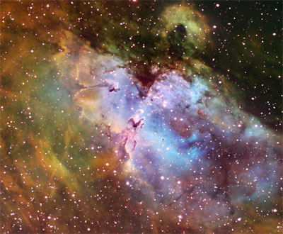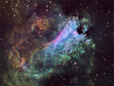Sharpless 49 This is M16, the Eagle Nebula. Besides the nebula and the associated OC, there are several dark structures visible: The dark notch from N is easy. The Star Queen or Pillars of creation are more difficult, two pillars of different length could be traced with OIII filter, the third and shortest one was observed close to the bright star and was the most difficult. There is another dark pillar in the E part (dubbed "Brennendes Schwein" from its appearance on Hubble images).