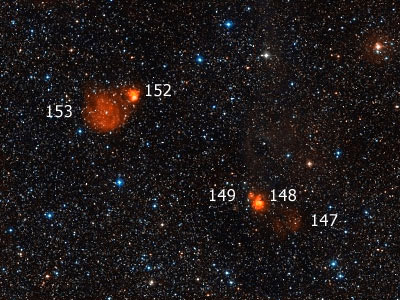Sharpless 148 and 152 and friends This is a group of Sharpless nebula of which only Sharpless 148 and 152 are distinct objects. Sh 152 best w/o filter, Sh 148 with H beta, other Shs unsuccessful.