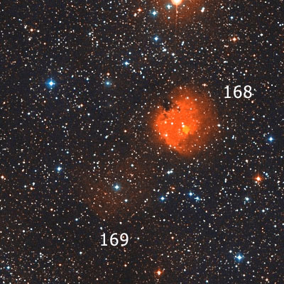 Sharpless 168/169 Group of two emission nebula, of which Sharpless 169 is extremely faint. At 200x and with H-beta filter, the central part of Sharpless 168 appeared as a round knot next to a pair of stars, Sharpless 169 was not visible.