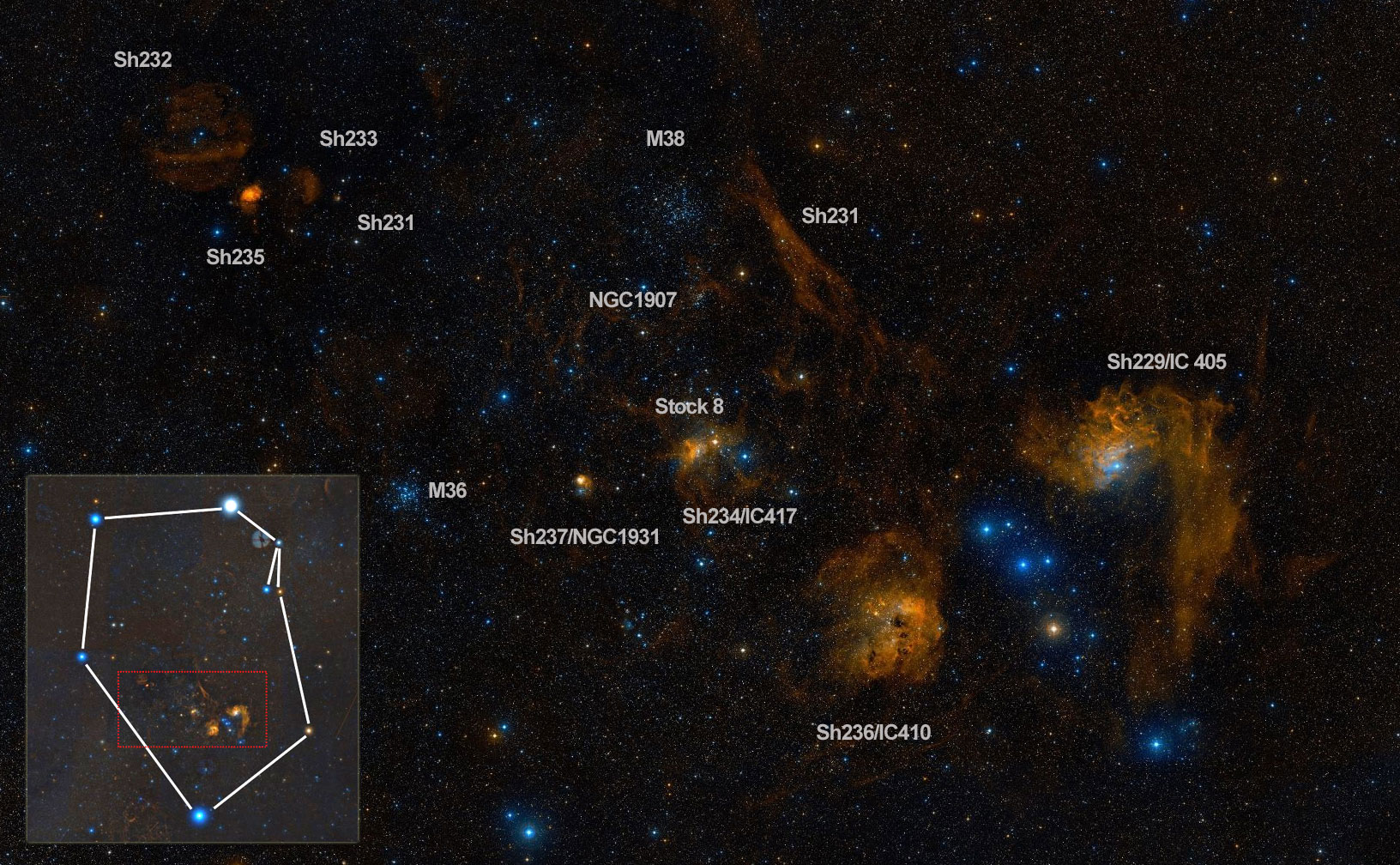 This image stretches over 10° of sky in the Auriga region and gives you a grand view of the Sharpless nebula in this area.