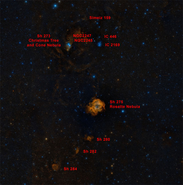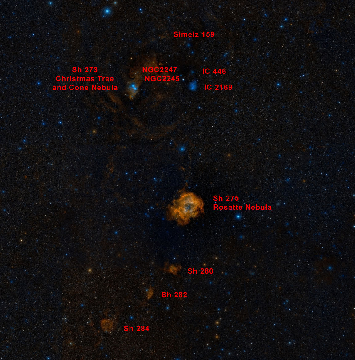 This image stretches over 15° of sky in the Monoceros region and gives you a grand view of the Sharpless nebula in this area.