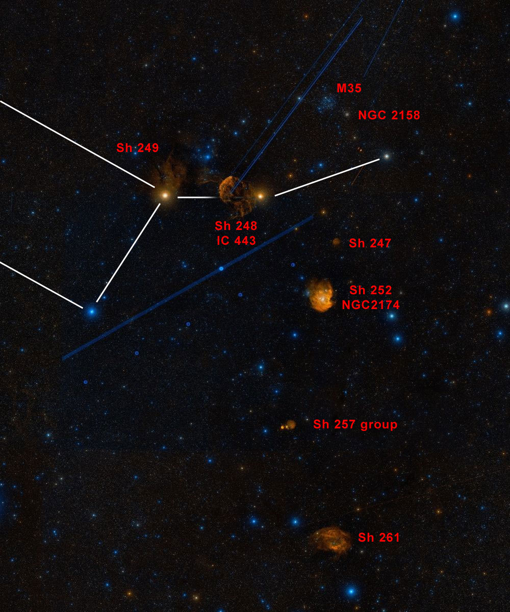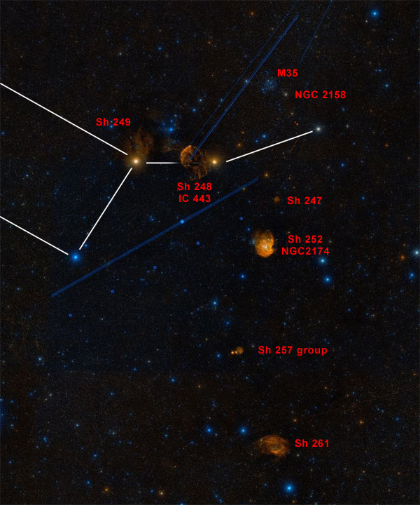 This image stretches over 10° of sky in the Gemini-Orion region and gives you a grand view of the Sharpless nebula in this area.