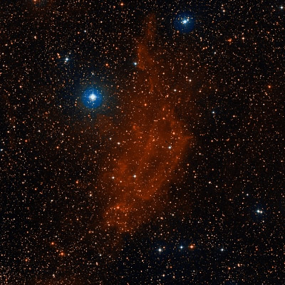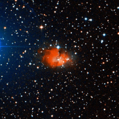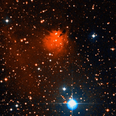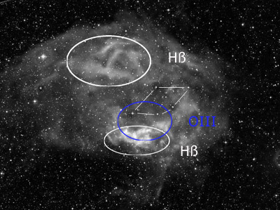 At 100x, this is a fairly faint nebula as compared to its brightness on the DSS. Responds both to OIII in the central part and to H beta in the outer parts (roughly marked in the DSS red image to the right). A large H beta region is N of the central part.