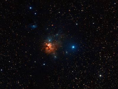 Sharpless 254 and friends These are the Three Snowballs in Orion, comprising as well Sh 255, 256, 257, and 258. In the 24 mm eyepiece of my 22-Inch Dob, the two more compact nebula 255 and 257 were easily visible with H-Beta filters as milky, well defined areas, each surrounding a star in the middle. Sharpless 254 was somewhat more diffuse, but could be seen without retinal torture. The entire group fit into the field of view of the eyepiece and the contrast between the diffuse 254 and the more compact 255 and 257 was particularly beautiful. With the UHC Filter, all three were still visible, yet much more difficult than with H-Beta. As to be expected for low-excitation HII regions, they were not visible with the OIII filter. After I had enjoyed the view of the group for some time, I shortly tested the small nebula Sharpless 258, which is to the left on the image. As there was nothing visible immediately, I did not try to push this, in particular as there are superimposed stars, which might be deceiving. Sh256, on the other hand, was well visible as a separate glow detached from the main mass of Sh257. field size 0.5° |